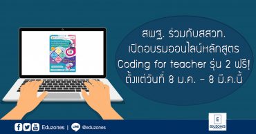 EZ Webmaster January 5, 2021 สพฐ. ร่วมกับสสวท. เปิดอบรมออนไลน์หลักสูตร Coding for teacher รุ่น 2 ฟรี! ตั้งแต่วันที่ 8 ม.ค. – 8 มี.ค.นี้ EZ Webmaster January 5, 2021 สำนักงานคณะกรรมการการศึกษาขั้นพื้นฐาน (สพฐ.) ร่วมกับสถาบันส่งเสริมการสอนวิทยาศาสตร์และเทคโนโลยี (สสวท.)ได้จัดอบรมออนไลน์ “หลักสูตรการจัดการเรียนรู้วิทยาการคำนวณสำหรับครู (C4T) รุ่น 2” และ “หลักสูตรการจัดการเรียนรู้วิทยาการคำนวณสำหรับครูขั้นสูง (C4T Plus) รุ่น 2” ให้แก่ครูระดับประถมศึกษาและระดับมัธยมศึกษาที่รับผิดชอบสอนรายวิชาวิทยาการคำนวณหรือครูที่รับผิดชอบสอนในรายวิชาอื่น ๆ ที่มีความสนใจ ฟรี ไม่มีค่าใช้จ่าย โดยเปิดอบรมตั้งแต่วันที่ 8 มกราคม – 8 มีนาคม 2564 สำหรับวัตถุประสงค์ในการเปิดอบรมเพื่อมุ่งเน้นการเรียนการสอนให้นักเรียนมีทักษะที่สำคัญ ในการดำรงชีวิตในศตวรรษที่ 21 ทั้งพื้นฐานความคิดเชิงคำนวณ (Computational… Continue Reading