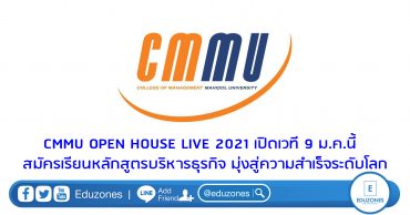 CMMU OPEN HOUSE LIVE 2021 เปิดเวที 9 ม.ค.นี้ สมัครเรียนหลักสูตรบริหารธุรกิจ มุ่งสู่ความสำเร็จระดับโลก EZ Webmaster January 5, 2021 CMMU ขอเชิญร่วมงาน CMMU OPEN HOUSE LIVE 2021 วันที่ 9 ม.ค. 2564 เปิดเวทีออนไลน์แนะนำหลักสูตรบริหารธุรกิจชั้นนำทั้งไทย-อินเตอร์ ระดับปริญญาโทจนถึงปริญญาเอก วันเดียวเท่านั้น รับส่วนลดค่าสมัครเรียน และเพิ่มโอกาสศึกษาต่อในสถาบันระดับโลก ผู้ช่วยศาสตราจารย์ ดร.ดวงพร อาภาศิลป์ คณบดีวิทยาลัยการจัดการ มหาวิทยาลัยมหิดล (CMMU) เปิดเผยว่า การศึกษาด้านบริหารจัดการธุรกิจในโลกสมัยใหม่มีความสำคัญมาก ทั้งมิติด้านการตลาด การเงิน ทรัพยากรบุคคล นวัตกรรม การวิจัยพัฒนา และความเข้าใจผู้บริโภค ซึ่ง CMMU เป็นสถาบันการศึกษาด้านบริหารธุรกิจชั้นนำของประเทศ ที่มีศักยภาพการเรียนการสอนตอบโจทย์ความสำเร็จทั้งระดับปริญญาโทการจัดการหลักสูตรไทยและนานาชาติ รวมถึงปริญญาเอก สาขาวิชาการจัดการ และปริญญาเอก สาขาวิชาภาวะผู้นำอย่างยั่งยืน “CMMU ได้รับการจัดอันดับให้เป็นหนึ่งใน 5% ของ Top of Business… Continue Reading