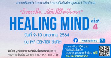 Healing Mind “โรคทางใจ…ต้องใช้ใจเยียวยา” EZ Webmaster January 4, 2021 มูลนิธิเยาวชนสัมพันธ์นานาชาติ (IYF) ประจำประเทศไทย กำหนดจัดค่าย Healing Mind “โรคทางใจ…ต้องใช้ใจเยียวยา” ในวันที่ 9-10 มกราคม 2564 เป็นเวลา 2 วัน 1 คืน ณ อาคาร IYF รังสิต พหลโยธิน 111 จังหวัดปทุมธานี โดยจัดขึ้นเป็นครั้งที่ 4 มีวัตถุประสงค์เพื่อสร้างภูมิคุ้นกันจิตใจให้แข็งแรง สร้างสุขภาวะทางอารมณ์และความคิดที่ดี พร้อมทั้งให้คำแนะนำทางการแก้ไขปัญหาด้านจิตใจแก่เยาวชน Continue Reading