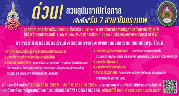 🎓 จุฬาฯ ชวนเปิดโลกการเรียนรู้ในงาน CU Open House 2026 ค้นหาเส้นทางอนาคต 28–29 มี.ค. นี้ EZ WebmasterMarch 18, 2026 🎓 จุฬาฯ ชวนเปิดโลกการเรียนรู้ในงาน CU Open House 2026 ค้นหาเส้นทางอนาคต 28–29 มี.ค. นี้ จุฬาลงกรณ์มหาวิทยาลัย เชิญชวนนักเรียน ผู้ปกครอง และผู้ที่สนใจ ร่วมเปิดประสบการณ์การเรียนรู้ในงาน CU Open… โรงเรียนนานาชาติจีน (CIS) จัดใหญ่ Open House 2026 ปั้นรากฐานเด็กประถม พร้อมยกระดับมัธยมปลายสู่มหาวิทยาลัยชั้นนำระดับโลก tui sakrapeeMarch 17, 2026 โรงเรียนนานาชาติจีน (China International School – CIS) ประสบความสำเร็จอย่างยิ่งในการจัดงาน Open House 2026 ภายใต้แนวคิด “China Now, Future Ready เปิดประตูสู่โลกอนาคตกับต้นฉบับโรงเรียนนานาชาติจีน” เมื่อวันที่ 14… กทม. เปิดฝึกอาชีพกว่า 80 วิชา ค่าเรียนเริ่ม 105 บาท เรียนจบรับใบประกาศจริง สมัคร 20 มี.ค. นี้ EZ WebmasterMarch 13, 2026 กทม. เปิดฝึกอาชีพกว่า 80 วิชา ค่าเรียนเริ่ม 105 บาท เรียนจบรับใบประกาศจริง สมัคร 20 มี.ค. นี้ กรุงเทพมหานคร เตรียมเปิดรับสมัครบุคคลทั่วไปเข้าร่วม หลักสูตรฝึกอาชีพของโรงเรียนฝึกอาชีพกรุงเทพมหานคร ประจำปี 2569 โดยเปิดสอนมากกว่า… ม.กรุงเทพ เปิดเวที “VISION HOUSE: Business Forum Series 2” ถอดรหัสอนาคตธุรกิจโลก AI ผ่านแนวคิด Nexus 3W tui sakrapeeMarch 11, 2026 VISION HOUSE: Business Forum Series 2 “Nexus 3W: Reimagining Wealth, Wellbeing & the World with AI” เปิดเวทีผู้นำอุตสาหกรรม ร่วมถอดรหัสอนาคตธุรกิจในโลก… Search for: Search Classic Blog สวนสุนันทาเปิดโอกาสพิเศษ รับ 7 สาขา รอบที่ 1 Portfolio ให้เลือกเรียนในกรุงเทพฯได้ tui sakrapee December 28, 2020 จากสถานการณ์แพร่ระบาดของเชื้อไวรัส C0VID-19 มหาวิทยาลัยราชภัฏสวนสุนันทาเปิดโอกาส ให้นักเรียนสมัครรอบที่ 1 portfolio ประจําปีการศึกษา 2564 ในส่วนกรุงเทพมหานครด้วย ดังนี้ สาขาวิชาที่เปิดรับสมัครเรียนทั้งในส่วนกลางกรุงเทพมหานครและวิทยาเขตนครปฐม ได้แก่ 1.สาขาวิชาการจัดการอุตสาหกรรมท่องเที่ยวและบริการ 2.สาขาวิชาการจัดการโรงแรมและธุรกิจที่พัก 3.สาขาวิชานิเทศศาสตร์ – แขนงวิชาวารสารศาสตร์ – แขนงวิชาการประชาสัมพันธ์และการสื่อสารองค์กร – แขนงวิชาการโฆษณาและสื่อสารการตลาด – แขนงวิชาวิทยุกระจายเสียงและวิทยุโทรทัศน์ – แขนงวิชาการภาพยนตร์และสื่อดิจิทัล สาขาวิชาที่เปิดรับสมัครเรียนกรุงเทพมหานคร เฉพาะปีการศึกษา 2564 และเรียนที่ วิทยาเขตนครปฐมตั้งแต่ปีการศึกษา 2565 เป็นต้นไป ได้แก่ 1.สาขาวิชารัฐประศาสนศาสตร์ – แขนงวิชาการปกครองท้องถิ่น – แขนงวิชาการบริหารภาครัฐและเอกชน – แขนงวิชานโยบายสาธารณะและการจัดการภาครัฐ 2.สาขาวิชานิติศาสตร์… Continue Reading สภามหาวิทยาลัยราชภัฏสวนสุนันทามีมติอนุมัติแต่งตั้ง 7 รองอธิการบดี tui sakrapee December 28, 2020 สภามหาวิทยาลัยราชภัฏสวนสุนันทา ในคราวประชุมครั้งที่ 12/2563 วันที่ 28 ธันวาคม 2563 มีมติอนุมัติแต่งตั้งร