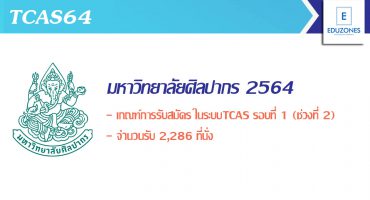 #TCAS64 ม.ศิลปากร เปิดรับสมัครนศ.ป.ตรี รอบที่ 1 Portfolio (ช่วงที่ 2) ถึงวันที่ 29 ต.ค.นี้ EZ Webmaster September 26, 2020 มหาวิทยาลัยศิลปากรรับสมัครคัดเลือกบุคคลเพื่อเข้าศึกษาในมหาวิทยาลัยศิลปากร ระดับปริญญาบัณฑิต (SU – TCAS) ประจำปีการศึกษา 2564 รอบที่ 1 Portfolio ช่วงที่ 2 ตั้งแต่วันที่ 28 กันยายน -29 ตุลาคม 2563 จำนวนรับ 2,286 ที่นั่ง คณะ/สาขาที่เปิดรับสมัคร -คณะสถาปัตยกรรมศาสตร์ -คณะมัณฑนศิลป์ -คณะศึกษาศาสตร์ -คณะวิศวกรรมศาสตร์และเทคโนโลยีอุตสาหกรรม -คณะดุริยางคศาสตร์ -คณะสัตวศาสตร์และเทคโนโลยีการเกษตร -คณะวิทยาการจัดการ -คณะเทคโนโลยีสารสนเทศและการสื่อสาร กำหนดการ -เปิดรับสมัคร ตั้งแต่วันที่ 28 กันยายน – 29 ตุลาคม 2563… Continue Reading