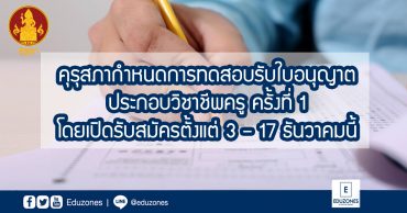 EZ Webmaster November 27, 2020 คุรุสภากำหนดการทดสอบรับใบอนุญาตประกอบวิชาชีพครู ครั้งที่ 1 โดยเปิดรับสมัครตั้งแต่ 3 – 17 ธันวาคมนี้ EZ Webmaster November 27, 2020 คุรุสภา กำหนดการทดสอบและประเมินสมรรถนะทางวิชาชีพครู ด้านความรู้และประสบการณ์วิชาชีพ ตามมาตรฐานวิชาชีพครู ครั้งที่ 1 (ใบประกอบวิชาชีพครู) ทั้งชาวไทย และชาวต่างประเทศ โดยจะเปิดรับสมัครตั้งแต่วันที่ 3 – 17 ธันวาคม 2563 สำหรับกำหนดการทดสอบและประเมินสมรรถนะทางวิชาชีพครู ด้านความรู้และประสบการณ์วิชาชีพ คณะกรรมการกำหนดให้ผู้ขอรับใบอนุญาตประกอบวิชาชีพครูต้องผ่านการทดสอบและประเมินสมรรถนะทางวิชาชีพครูตามประกาศคณะกรรมการคุรุสภา เรื่อง หลักเกณฑ์และวิธีการทดสอบ และประเมินสมรรถนะทางวิชาชีพครู พ.ศ. 2563 ซึ่งกำหนดองค์ประกอบของสมรรถนะทางวิชาชีพที่จะทดสอบและประเมินไว้ 2 ส่วน ได้แก่ (1) การทดสอบและประเมินสมรรถนะทางวิชาชีพครู ด้านความรู้และประสบการณ์วิชาชีพ ตามมาตรฐานวิชาชีพครู … Continue Reading