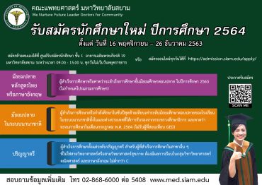 รับตรง คณะแพทย์ ม.สยาม รอบที่ 1 EZ Webmaster November 24, 2020 ด้วยคณะแพทย์ ม.สยาม กำลังเปิดรับสมัครบุคคลเพื่อคัดเลือกเข้าศึกษาหลักสูตรแพทยศาสตรบัณฑิต ปีการศึกษา 2564 รอบที่ 1 ระหว่างวันที่ 16 พ.ย. – 26 ธ.ค. 63 โดยเปิดรับสมัคร 2 ช่องทาง คือ 1. สมัครออนไลน์ทุกวันได้ที่ https://admission.siam.edu/apply/ 2. สมัครด้วยตนเองได้ที่ ศูนย์รับสมัครนักศึกษา ชั้น 1 อาคารเฉลิมพระเกียรติ 19 มหาวิทยาลัยสยาม ระหว่างเวลา 09.00 – 15.00 น. (ทุกวัน ไม่เว้นวันหยุดราชการ) รายละเอียดการรับสมัคร https://bit.ly/3fbQqWR เว็บไซต์ คณะแพทย์ ม.สยาม… Continue Reading