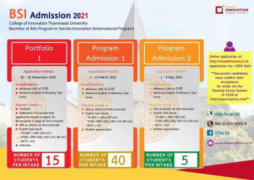 BSI Admissions 2021” การรับสมัครหลักสูตรนานาชาติ วิทยาลัยนวัตกรรม มหาวิทยาลัยธรรมศาสตร์ EZ Webmaster November 18, 2020 BSI หลักสูตรปริญญาตรี ศิลปศาสตรบัณฑิต สาขาวิชานวัตกรรมการบริการ BACHELOR OF ARTS PROGRAM IN SERVICE INNOVATION (INTERNATIONAL PROGRAM) . เปิดรับสมัคร 1) รอบ Inter Portfolio 1 ตั้งแต่วันที่ 20-30 พฤศจิกายน 2563 2) รอบ Inter Program-admission 1 ตั้งแต่วันที่ 1-15 มีนาคม 2564 3) รอบ Inter Program-admission 2 ตั้งแต่วันที่ 1-9 พฤษภาคม 2564… Continue Reading