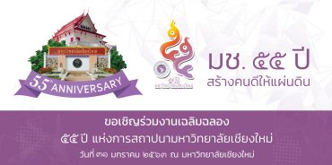 งานเฉลิมฉลอง 55 ปี แห่งการสถาปนามหาวิทยาลัยเชียงใหม่ “มช. 55 ปี สร้างคนดีให้แผ่นดิน” EZ Webmaster December 24, 2019 ศาสตราจารย์คลินิก นายแพทย์ นิเวศน์ นันทจิต อธิการบดีมหาวิทยาลัยเชียงใหม่ เปิดเผยว่า มหาวิทยาลัยเชียงใหม่เป็นมหาวิทยาลัยแห่งแรกในภูมิภาค จัดตั้งขึ้นตามนโยบายของรัฐ และเจตนารมณ์ของประชาชนในภาคเหนือเพื่อให้เป็นศูนย์กลางทางวิชาการและวิชาชีพชั้นสูง ได้เปิดทำการเรียนการสอนครั้งแรก เมื่อวันที่ 18 มิถุนายน 2507 และได้รับพระมหากรุณาธิคุณจากพระบาทสมเด็จพระบรมชนกาธิเบศร มหาภูมิพล อดุลยเดชมหาราช บรมนาถบพิตร รัชกาลที่ 9 เสด็จพระราชดำเนินทรงเปิดมหาวิทยาลัยเชียงใหม่อย่างเป็นทางการ เมื่อวันที่ 24 มกราคม 2508 นับตั้งแต่นั้นเป็นต้นมา มหาวิทยาลัยจึงได้กำหนดให้ วันที่ 24 มกราคมของทุกปี เป็นวันสถาปนามหาวิทยาลัยเชียงใหม่ ในปี พ.ศ. 2563 มหาวิทยาลัยเชียงใหม่ได้ครบรอบ 55 ปี แห่งการสถาปนา ในโอกาสนี้ มหาวิทยาลัย เชียงใหม่จึงกำหนดให้มีการจัดงานเฉลิมฉลอง 55… Continue Reading
