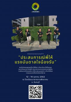 โครงการค่ายอาสา “ประสบการณ์พี่ให้ แรงบันดาลใจน้องรับ” EZ Webmaster September 13, 2019 เนื่องด้วย กลุ่มจิตอาสานักเรียนทุน ๑ อำเภอ ๑ ทุน (ODOS VOLUNTEER) ซึ่งเป็นกลุ่มจิตอาสาที่ก่อตั้งขึ้นโดยการรวมกลุ่มของผู้สำเร็จการศึกษาด้วยทุนรัฐบาลโครงการ ๑ อำเภอ ๑ ทุน สร้างขึ้นโดยวัตถุประสงค์เพื่อทำความดี และทำกิจกรรมต่างๆ ผลักดันให้สังคมเกิดความเปลี่ยนแปลงไปในทางที่ดีขึ้น มีความประสงค์จะจัดกิจกรรมด้านการศึกษาภายใต้ชื่อโครงการค่ายอาสา “ประสบการณ์พี่ให้ แรงบันดาลใจน้องรับ” ให้แก่นักเรียนระดับมัธยมศึกษาตอนปลายในจังหวัดจันทบุรีและจังหวัดใกล้เคียง ในวันที่ ๑๒ – ๑๔ ตุลาคม พ.ศ.๒๕๖๒ (๓ วัน ๒ คืน) ณ โรงเรียนนายายอามพิทยาคม จังหวัดจันทบุรี กิจกรรมในครั้งนี้มีผู้เข้าร่วมประมาณ ๘๐ คน และมีวัตถุประสงค์หลักคือ เพื่อสร้างแรงบันดาลใจในการเรียน สร้างความเชื่อมั่น ศรัทธา และเห็นคุณค่าในตัวเองให้แก่นักเรียนที่เข้าร่วมกิจกรรม รวมทั้งเพื่อแนะแนวทางในการค้นหาตนเอง… Continue Reading