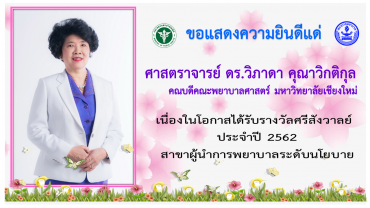 คณบดีคณะพยาบาลศาสตร์ มช. รับรางวัลศรีสังวาลย์ สาขาผู้นำการพยาบาลระดับนโยบาย EZ Webmaster August 19, 2019 รางวัลศรีสังวาล เป็นรางวัลที่ได้รับพระมหากรุณาธิคุณจากพระบาทสมเด็จพระบรมชนกาธิเบศร มหาภูมิพลอดุลยเดชมหาราช บรมนาถบพิตร พระราชทานพระนามเดิม “สังวาลย์” ของสมเด็จพระศรีนครินทราบรมราชชนนี มาเป็นชื่อรางวัลนับเป็นเกียรติยศสูงสุดของพยาบาลไทย โดยมอบแด่ผู้ประกอบวิชาชีพการพยาบาลและการผดุงครรภ์ที่มีผลงานเด่นระดับประเทศ เพื่อเชิดชูเกียรติพยาบาลผู้เป็นแบบอย่างที่ดีและมีผลงานดีเด่นเป็นที่ประจักษ์ระดับประเทศ เป็นการเสริมสร้างขวัญกำลังใจแก่ผู้ได้รับรางวัลและบุคลากรพยาบาลโดยรวมรางวัลศรีสังวาลย์แบ่งเป็น 3 สาขา ได้แก่ สาขาการพยาบาลในสถานบริการ สาขาการพยาบาลในชุมชนและ สาขาผู้นำทางการพยาบาลระดับนโยบาย โดยในปี 2562 เป็นที่น่ายินดีอย่างยิ่งที่ ศาสตราจารย์ ดร.วิภาดา คุณาวิกติกุล คณบดีคณะพยาบาลศาสตร์ มหาวิทยาลัยเชียงใหม่ ได้รับรางวัลศรีสังวาลย์ ประจำปี 2562 สาขาผู้นำการพยาบาลระดับนโยบาย รางวัลศรีสังวาลย์จะได้รับพระราชทานรางวัลจากสมเด็จพระกนิษฐาธิราชเจ้า กรมสมเด็จพระเทพรัตนราชสุดาฯ สยามบรมราชกุมารี โดยเป็นโล่รางวัลและใบประกาศเกียรติคุณพร้อมด้วยเงินรางวัลจำนวน 300,000 บาท (สามแสนบาทถ้วน) ศาสตราจารย์ ดร.วิภาดา คุณาวิกติกุล เป็นผู้นำองค์กรมีการบริหารงานที่โดดเด่นเป็นที่ประจักษ์ มีการปฏิบัติงานในวิชาชีพการพยาบาลและผดุงครรภ์ ตลอดจนด้านวิชาการพยาบาล… Continue Reading