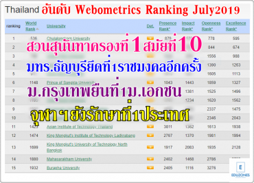 จุฬาฯที่1ประเทศ-สวนสุนันทาอันดับโลกพุ่งแชมป์ราชภัฏ10สมัย มทร.ธัญบุรีครองที่1ราชมงคล-ม.กรุงเทพยืนที่1ม.เอกชน จากอันดับ Webometrics Ranking July2019 tui sakrapee July 29, 2019 จุฬาฯที่1ประเทศ-สวนสุนันทา อันดับโลกพุ่ง แชมป์ราชภัฏ10สมัย มทร.ธัญบุรีครองที่1ราชมงคล-ม.กรุงเทพยืนที่1ม.เอกชน จากอันดับ Webometrics Ranking July 2019 ………………………………………………………………………………………… หมายเหตุ: ข้อมูลอันดับจากการปรับเปลี่ยนล่าสุด เมื่อ 5ส.ค.62 ของ http://www.webometrics.info/en/Asia/Thailand ทำให้อันดับบางมหาวิทยาลัยปรับเปลี่ยนไปด้วย โดยผู้สนใจสามารถเข้าไปตรวจสอบในเว็บไซต์ดังกล่าวได้ ……………………………………………………………………………………….. จุฬาฯยังครองอันดับ 1 ของประเทศ ในการจัดอันดับคุณภาพด้านวิชาการของเวบโบเมตริกส์จากประเทศสเปน ด้าน “สวนสุนันทา” ขึ้นแท่นยาว แถมอันดับโลกพุ่ง ถึง509 ขั้น ผงาดครองแชมป์กลุ่มมหาวิทยาลัยราชภัฏ เป็นสมัยที่ 10 สำเร็จ ในกลุ่มมหาวิทยาลัยเทคโนโลยีราชมงคล “มทร.ธัญบุรี” ครองอันดับ 1ไว้ได้อีกสมัย ส่วน “ม.กรุงเทพ” คว้าอันดับ 1 ม.เอกชนไว้ได้อย่างเหนียวแน่น Cybermetrics… Continue Reading