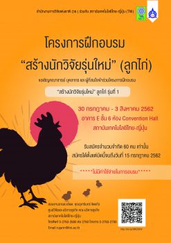 โครงการฝึกอบรม “สร้างนักวิจัยรุ่นใหม่” (ลูกไก่) รุ่นที่ 1 EZ Webmaster June 28, 2019 สำนักงานคณะกรรมการวิจัยแห่งชาติ (วช.) ร่วมกับ สถาบันเทคโนโลยีไทย-ญี่ปุ่น (TNI) ได้กำหนดโครงการฝึกอบรม “สร้างนักวิจัยรุ่นใหม่” (ลูกไก่) รุ่นที่ 1 ระหว่างวันที่ 30 กรกฎาคม – 3 สิงหาคม 2562 ณ อาคาร E ชั้น 6 ห้อง Convention Hall สถาบันเทคโนโลยีไทย-ญี่ปุ่น ให้แก่บุคคลที่ปฏิบัติงานเกี่ยวข้องกับการวิจัย โดยมีวัตถุประสงค์เพื่อเพิ่มความรู้ทักษะ และประสบการณ์ด้านการวิจัยให้กับบุคลากรของมหาวิทยาลัยและสถาบันการศึกษาเครือข่าย ให้มีความรู้ ความเข้าใจ และเรียนรู้ประสบการณ์เกี่ยวกับการวิจัยเพื่อการพัฒนาประเทศ ให้สามารถจัดทำข้อเสนอการวิจัยได้ และบูรณาการเครือข่ายนักวิจัยจากหน่วยงานราชการ องค์กรวิจัยต่างๆ ให้เข้มแข็งและยั่งยืนต่อไป ขอเชิญท่านที่ปฏิบัติงานเกี่ยวข้องกับการวิจัยและมีคุณสมบัติตามที่กำหนด สมัครเข้ารับการฝึกอบรม โดยไม่มีค่าใช้จ่ายในการลงทะเบียน ตั้งแต่วันนี้ จนถึงวันที่ 15 กรกฏาคม 2562 สำหรับข้าราชการ พนักงาน และบุคลากรของรัฐสามารถเข้ารับการฝึกอบรมได้โดยไม่ถือเป็นวันลา และมีสิทธิ์เบิกค่าใช้จ่ายต่างๆ จากต้นสังกัด ตามระเบียบของทางราชการ ผลการพิจารณาคัดเลือกให้เข้ารับการฝึกอบรม… Continue Reading