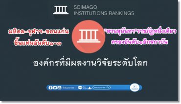 มหิดล-จุฬาฯ-ขอนแก่น ขึ้นแท่นอันดับ1-3 มีผลงานวิจัยระดับโลก “สวนสุนันทา” หนึ่งเดียวของราชภัฏ ครองอันดับ1อีกสถาบัน tui sakrapee June 17, 2019 มหิดล-จุฬาฯ-ขอนแก่น ขึ้นแท่นอันดับ1-3 ด้าน “สวนสุนันทา” พุ่งติดโผเป็นหนึ่งเดียวของราชภัฏ ครองอันดับ 1 อีกสถาบัน จากผลการจัดอันดับองค์กรที่มีผลงานวิจัยระดับโลก ประจำปี พ.ศ. 2562 ของ SCImago Institutions Rankings 2019 Scimago Lab ได้เผยแพร่ผลการจัดอันดับสถาบันการศึกษาระดับอุดมศึกษาทั่วโลก ประจำปี 2562 (Scimago Institutions Rankings 2019) ผ่านเว็บไซต์ https://www.scimagoir.com ซึ่งผลการจัดอันดับประเภทภาพรวม (Overall Rank) ปรากฎว่ามีมหาวิทยาลัยในไทยติดอันดับจำนวน 22 แห่ง ดังนี้ อันดับ 1 Mahidol University (522) อันดับ 2 Chulalongkorn University… Continue Reading
