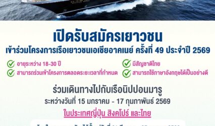 Blogทุนดีดี ทุนโครงการเรือเยาวชนเอเชียอาคเนย์ ครั้งที่ 49 ประจำปี 2569 เปิดรับสมัครแล้ว tui sakrapee April 2, 2025 โครงการเรือเยาวชนเอเชียอาคเนย์ (Ship for Southeast Asian and Japanese Youth Program)เป็นโครงการตามข้อตกลงร่วมกันระหว่างรัฐบาลญี่ปุ่นกับรัฐบาลประเทศในเอเชียอาคเนย์๕ ประเทศ คือ สาธารณรัฐอินโดนีเซีย มาเลเซีย สาธารณรัฐฟิลิปปินส์สาธารณรัฐสิงคโปร์และราชอาณาจักรไทย ทำขึ้นเมื่อเดือนมกราคม ๒๕๑๗…