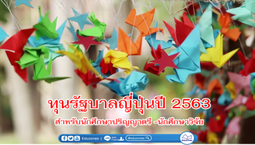 ทุนรัฐบาลญี่ปุ่นปี 2563 สำหรับนักศึกษาปริญญาตรี -นักศึกษาวิจัย tui sakrapee May 6, 2019 ประกาศรับสมัครทุนการศึกษาของรัฐบาลญี่ปุ่นปี 2563 สำหรับนักศึกษาปริญญาตรี -นักศึกษาวิจัย 1. ประเภททุนนักศึกษาวิจัย (Research Students) • Application Guidelines • Annex (กำหนดการและข้อกำหนดของประเทศไทย) • Application Form • Field of Study and Research Plan • Placement Preference Application Form (*ไม่จำเป็นต้องติดต่อและได้รับการตอบรับจากอาจารย์ก่อนสมัครทุน) • Admission Form (บัตรเข้าห้องสอบ) • แหล่งอ้างอิงสำหรับการค้นหามหาวิทยาลัยและนักวิจัย 2. ประเภททุนนักศึกษาปริญญาตรี (Undergraduate Students) • Application Guidelines • Annex (กำหนดการและข้อกำหนดของประเทศไทย) • Application Form • Admission Form (บัตรเข้าห้องสอบ) เปิดรับใบสมัครตั้งแต่ วันจันทร์ที่ 3 ถึง วันศุกร์ที่… Continue Reading
