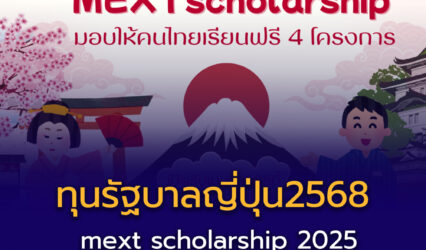 ทุนดีดี ทุนรัฐบาลญี่ปุ่น ประจำปีการศึกษา 2568 EZ Webmaster March 14, 2025 สถานเอกอัครราชทูตญี่ปุ่นประจำประเทศไทย เตรียมเปิดรับสมัครทุนการศึกษารัฐบาลญี่ปุ่น ประจำปีการศึกษา 2568 โดยมีทุนการศึกษาที่จะเปิดรับในเดือนเมษายน 2568 จำนวน 4 ประเภททุน 4 โครงการทุนที่จะเปิดรับเดือนเมษายน 2568 1.ทุนนักศึกษาปริญญาตรี (Undergraduate Students) สถานเอกอัครราชทูตญี่ปุ่นประจำประเทศไทย…