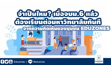 Blogข่าวเด่น จำเป็นไหม? เมื่อจบม.6 แล้วต้องเรียนต่อมหาวิทยาลัยทันที จากความคิดเห็นของชุมชน EDUZONES EZ Webmaster March 13, 2025 หลังจากที่มีการสำรวจความคิดเห็นในหัวข้อ “จำเป็นไหม? เมื่อจบม.6 แล้วต้องเรียนต่อมหาวิทยาลัยทันที” ผ่านโพสต์ https://www.facebook.com/eduzonesdotcom/posts/10159410251966171 ไปนั้น จากความคิดเห็นของชาวชุมชน eduzones สามารถสรุปได้ ดังนี้ค่ะ จากความคิดเห็นของคนส่วนใหญ่กับหัวข้อดังกล่าวให้ความเห็นว่า “จำเป็น” ต้องเรียนต่อมหาวิทยาลัยทันที โดยส่วนใหญ่ให้เหตุผลประกอบไปในทิศทางเดียวกัน 4…