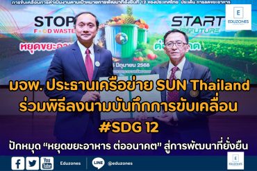 มจพ.ประธานเครือข่าย SUN Thailand ร่วมพิธีลงนามบันทึกการขับเคลื่อน #SDG 12 พร้อมปักหมุด “หยุดขยะอาหาร ต่ออนาคต” สู่การพัฒนาที่ยั่งยืน EZ Webmaster June 27, 2025 รศ.ดร.ณัฐพงศ์ มกระธัช รองอธิการบดีฝ่ายพัฒนากิจการมหาวิทยาลัยเพื่อความยั่งยืน มหาวิทยาลัยเทคโนโลยีพระจอมเกล้าพระนครเหนือ (มจพ.) ประธานเครือข่ายมหาวิทยาลัยยั่งยืนแห่งประเทศไทย (SUN Thailand) พร้อมด้วย รศ.ดร.ศักดา กตเวทวารักษ์ ผู้ช่วยอธิการบดีฝ่ายพัฒนาสิ่งแวดล้อมและกายภาพ ร่วมพิธีลงนามบันทึกความเข้าใจการขับเคลื่อนการดำเนินงานตามเป้าหมายการพัฒนาที่ยั่งยืนที่#SDG 12 ของประเทศไทย สร้างหลักประกันให้มีรูปแบบการผลิตและการบริโภคที่ยั่งยืน เป้าหมายย่อยที่ 12.3 ประเด็นการลดขยะอาหาร (food waste) อย่างเป็นระบบ โดยได้รับเกียรติจาก ดร.เฉลิมชัย ศรีอ่อน รัฐมนตรีว่าการกระทรวงทรัพยากรธรรมชาติและสิ่งแวดล้อม เป็นประธานเปิดงาน โดยมีเครือข่ายมหาวิทยาลัยยั่งยืนแห่งประเทศ และภาคีเครือข่ายองค์กรนำร่อง 15 หน่วยงาน ทั้งภาครัฐและเอกสาร ร่วมพิธี ณ ห้องประชุมศักดิ์สิทธิ์ ตรีเดช ชั้น 2 กระทรวงทรัพยากรธรรมชาติและสิ่งแวดล้อม สำนักงานนโยบายและแผนทรัพยากรธรรมชาติและสิ่งแวดล้อม ฐานะเป็นผู้ประสานงานกลาง (Focal… Continue Reading
