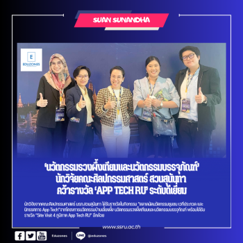นักวิจัยคณะศิลปกรรมศาสตร์ สวนสุนันทา คว้ารางวัลนวัตกรรม “App Tech RU” ระดับดีเยี่ยม tui sakrapee June 28, 2025 สถาบันวิจัยและพัฒนา มหาวิทยาลัยราชภัฏสวนสุนันทา นำทีมนักวิจัยเข้าร่วมกิจกรรม “ตลาดนัดนวัตกรรมชุมชน เวทีประกวด และนิทรรศการ App Tech” เครือข่ายมหาวิทยาลัยราชภัฏ 38 แห่งทั่วประเทศ ณ ลาน Outdoor Promotion ศูนย์การค้าเซ็นทรัล นครศรีธรรมราช เมื่อวันที่ 23 มิถุนายน 2568 โดยได้รับเกียรติจากผู้ว่าราชการจังหวัดนครศรีธรรมราชเป็นประธานกล่าวต้อนรับ และมีผู้ช่วยศาสตราจารย์ ดร.สมรักษ์ รอดเจริญ รองอธิการบดี มหาวิทยาลัยราชภัฏนครศรีธรรมราช กล่าวรายงาน พร้อมด้วย รองศาสตราจารย์ ดร.อุเทน คำน่าน รองผู้อำนวยการหน่วยบริหารและจัดการทุนด้านการพัฒนาระดับพื้นที่ (บพท.) กล่าวเปิดกิจกรรม ภายในงานมีพิธีมอบ รางวัล App Tech RU เพื่อยกย่องเชิดชูผลงานวิจัยและนวัตกรรมที่โดดเด่น โดยมหาวิทยาลัยราชภัฏสวนสุนันทาได้รับ… Continue Reading