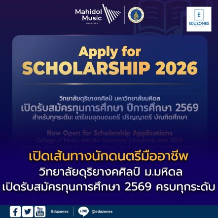 เปิดเส้นทางนักดนตรีมืออาชีพ! วิทยาลัยดุริยางคศิลป์ ม.มหิดล เปิดรับสมัครทุนการศึกษา 2569 ครบทุกระดับ EZ Webmaster April 22, 2026 🎶 เปิดเส้นทางนักดนตรีมืออาชีพ! วิทยาลัยดุริยางคศิลป์ ม.มหิดล เปิดรับสมัครทุนการศึกษา 2569 ครบทุกระดับ โอกาสสำคัญสำหรับนักดนตรีรุ่นใหม่มาถึงแล้ว วิทยาลัยดุริยางคศิลป์ มหาวิทยาลัยมหิดล หนึ่งในสถาบันดนตรีชั้นนำของประเทศไทย ประกาศเปิดรับสมัครนักเรียนและนักศึกษาเพื่อเข้ารับ ทุนการศึกษาประจำปีการศึกษา 2569 ในปีนี้มีความพิเศษด้วยการร่วมมือกับองค์กรและมูลนิธิชั้นนำ เพื่อสนับสนุนศักยภาพด้านดนตรีของเยาวชนไทยอย่างเต็มที่ ตั้งแต่ระดับพื้นฐานไปจนถึงระดับมืออาชีพ 🌟 รวม 5 แหล่งทุนศักยภาพ เสริมโอกาสสู่เวทีระดับสากล โครงการทุนการศึกษาครั้งนี้ครอบคลุมหลากหลายรูปแบบ เพื่อตอบโจทย์นักดนตรีที่มีความสามารถและความตั้งใจ ได้แก่ 🎓 ทุนเปรมดนตรี – สนับสนุนการศึกษาดนตรีระดับสูง 🎤 ทุนมูลนิธิ LOVEiS Music – ส่งเสริมดนตรีสมัยใหม่และความคิดสร้างสรรค์ 🏢 ทุน ThaiBev – การสนับสนุนจากภาคเอกชนด้านศิลปวัฒนธรรม 🌱… Continue Reading