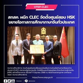 สกสค. ผนึก CLEC จีน จัดตั้งศูนย์สอบ HSK ขยายโอกาสการศึกษาภาษาจีนทั่วประเทศ tui sakrapee June 12, 2025 กระทรวงศึกษาธิการ โดยสำนักงานคณะกรรมการส่งเสริมสวัสดิการและสวัสดิภาพครูและบุคลากรทางการศึกษา (สกสค.) ร่วมกับศูนย์แลกเปลี่ยนและส่งเสริมความร่วมมือด้านภาษาจีนระหว่างประเทศ (CLEC) แห่งสาธารณรัฐประชาชนจีน จัดพิธีรับมอบป้ายศูนย์สอบวัดระดับความรู้ภาษาจีน (HSK) อย่างเป็นทางการ เมื่อวันที่ 11 มิถุนายน 2568 ณ ห้องดำรงราชานุภาพ อาคารราชวัลลภ กระทรวงศึกษาธิการ ในพิธีครั้งนี้ Mr. Yunfeng Yu ผู้อำนวยการศูนย์ CLEC ได้ส่งมอบป้ายศูนย์สอบ HSK ให้แก่ องค์การค้าของสำนักงานคณะกรรมการส่งเสริมสวัสดิการและสวัสดิภาพครูและบุคลากรทางการศึกษา (สกสค.) โดยมี นายพัฒนะ พัฒนทวีดล รองเลขาธิการคณะกรรมการการศึกษาขั้นพื้นฐาน ซึ่งทำหน้าที่รักษาการแทนผู้อำนวยการองค์การค้า เป็นผู้แทนรับมอบ ทั้งนี้ พิธีรับมอบจัดขึ้นอย่างสมเกียรติ โดยมี พลตำรวจเอก เพิ่มพูน ชิดชอบ รัฐมนตรีว่าการกระทรวงศึกษาธิการ ดร.พีระพันธ์… Continue Reading
