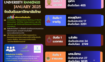 Blogครู-อาจารย์ “จุฬาฯ” ยังยืนที่ 1 ประเทศ “สวนสุนันทา” แชมป์ราชภัฏ 21สมัย “มทร.อีสาน” ที่ 1 ราชมงคล “ม.รังสิต” ที่ 1 ม.เอกชน จากอันดับ Webometrics Ranking January 2025 tui sakrapee January 28, 2025 “จุฬาฯ” ยังครองที่ 1 ประเทศ ส่วน “สวนสุนันทา” ยังยืนตำแหน่งแชมป์ราชภัฏยาวนาน 21 สมัย “มทร.อีสาน” ครองที่ 1 ราชมงคล ด้าน ม.รังสิต ยังที่…