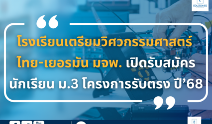 Blogนักเรียน โรงเรียนเตรียมวิศวกรรมศาสตร์ ไทย-เยอรมัน มจพ. เปิดรับสมัครนักเรียน ม.3 โครงการรับตรง ปี’68 EZ Webmaster January 10, 2025 โรงเรียนเตรียมวิศวกรรมศาสตร์ ไทย-เยอรมัน มจพ. เปิดรับสมัครนักเรียน ม.3 โครงการรับตรง ปี’68 โรงเรียนเตรียมวิศวกรรมศาสตร์ ไทย-เยอรมัน วิทยาลัยเทคโนโลยีอุตสาหกรรม มหาวิทยาลัยเทคโนโลยีพระจอมเกล้าพระนครเหนือ (มจพ.) เปิดรับสมัครนักเรียนชั้นมัธยมศึกษาตอนต้น (ม.3) เข้าศึกษาระดับประกาศนียบัตรวิชาชีพ…