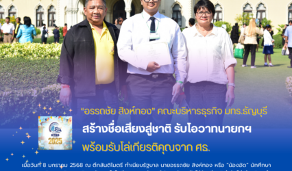 Blogนักศึกษา “อรรถชัย สิงห์ทอง” คณะบริหารธุรกิจ มทร.ธัญบุรี สร้างชื่อเสียงสู่ชาติ รับโอวาทนายกฯ พร้อมโล่จาก ศธ. tui sakrapee January 9, 2025 เมื่อวันที่ 8 มกราคม 2568 ณ ตึกสันติไมตรี ทำเนียบรัฐบาล นายอรรถชัย สิงห์ทอง หรือ “น้องอัด” นักศึกษาจากคณะบริหารธุรกิจ มหาวิทยาลัยเทคโนโลยีราชมงคลธัญบุรี (มทร.ธัญบุรี) ได้รับเกียรติเข้ารับโล่เกียรติคุณในฐานะเด็กและเยาวชนที่นำชื่อเสียงมาสู่ประเทศชาติจาก พลตำรวจเอก…