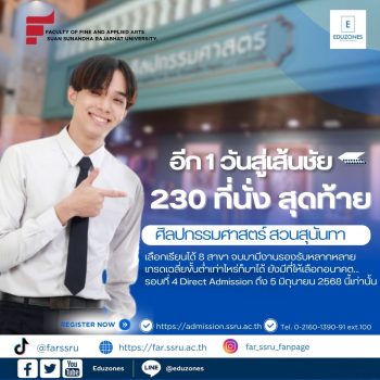 tui sakrapee June 4, 2025 8 สาขาสู่เส้นชัย! รอบสุดท้าย Direct Admission ศิลปกรรมศาสตร์ สวนสุนันทา เปิดรับทุกสาขา ไม่มีเกรดเฉลี่ยขั้นต่ำ รับแค่ 230 ที่นั่ง !! tui sakrapee June 4, 2025 คณะศิลปกรรมศาสตร์ มหาวิทยาลัยราชภัฏสวนสุนันทา เปิดรับสมัครบุคคลเข้าศึกษาในมหาวิทยาลัย ราชภัฏสวนสุนันทาภาคปกติ ระดับปริญญาตรี ประจำปีการศึกษา 2568 (รอบที่ 4 Direct Admission) ระหว่างวันที่ 27 พฤษภาคม 2568 – 5 มิถุนายน 2568 จำนวนจำกัดเพียง 230 ที่นั่งเท่านั้น !!! จำนวนที่จะรับ จำแนกตามสาขาวิชา และรหัสวิชาสอบ การรับสมัครรอบ 4 Direct Admission 1. เปิดรับสมัคร… Continue Reading