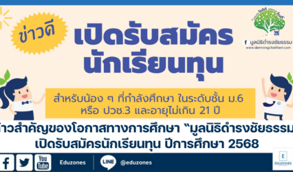 นักเรียน ก้าวสำคัญของโอกาสทางการศึกษา “มูลนิธิดำรงชัยธรรม” เปิดรับสมัครนักเรียนทุน ปีการศึกษา 2568 EZ Webmaster December 25, 2024 โอกาสดีๆ มาถึงแล้ว! มูลนิธิดำรงชัยธรรม เปิดโอกาสทางการศึกษาให้เยาวชนไทย มอบทุนการศึกษา ครบวงจรจนจบปริญญาตรี ผ่านโครงการ “ทุนสร้างคน สร้างบัณฑิต” โดย คุณไพบูลย์ ดำรงชัยธรรม ประธานกรรมการและผู้ก่อตั้งมูลนิธิฯ ได้ตั้งเป้าหมายส่งเสริมและสนับสนุนด้านการศึกษาให้กับเยาวชนของชาติ เพราะการศึกษาเป็นรากฐานสำคัญในการพัฒนาศักยภาพ เพื่อก้าวสู่อนาคตที่ดีในชีวิต โดยมอบทุนการศึกษาแก่เยาวชนที่เรียนดีมีความประพฤติดี แต่ขาดแคลนทุนทรัพย์ ซึ่งทุนการศึกษาครอบคลุมค่าใช้จ่ายที่มีความจำเป็นต่อการศึกษาและดำรงชีพ ได้แก่ ค่าเล่าเรียน ค่าใช้จ่ายที่เกี่ยวเนื่องกับการศึกษา …
