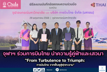 จุฬาฯ ร่วมการบินไทย นำความรู้คู่ฟ้า และเสวนา “From Turbulence to Triumph: การบินไทย จากฟื้นฟูสู่พุ่งทะยาน” EZ Webmaster May 30, 2025 จุฬาฯ ร่วมการบินไทย นำความรู้คู่ฟ้าและเสวนา “From Turbulence to Triumph: การบินไทย จากฟื้นฟูสู่พุ่งทะยาน” จุฬาลงกรณ์มหาวิทยาลัยร่วมกับบริษัท การบินไทย จำกัด (มหาชน)จัดพิธีลงนามความร่วมมือในการส่งเสริมและพัฒนาศักยภาพทางการศึกษาและแลกเปลี่ยนองค์ความรู้เพื่อสร้างคุณค่าให้องค์กรและสังคมผ่านกิจกรรมหลากหลายรูปแบบ ซึ่งจะนำไปสู่การพัฒนาอย่างยั่งยืนในระดับองค์กร ประเทศ และสากล โดยมี ศ.ดร.วิเลิศ ภูริวัชร อธิการบดีจุฬาลงกรณ์มหาวิทยาลัย และนายชาย เอี่ยมศิริ ประธานเจ้าหน้าที่บริหาร บริษัท การบินไทยฯ ร่วมลงนามความร่วมมือ เมื่อวันที่ 29 พฤษภาคม2568 ณ ห้อง 111 อาคาร มหาจุฬาลงกรณ์ การลงนามความร่วมมือระหว่างจุฬาลงกรณ์มหาวิทยาลัยและบริษัทการบินไทย จำกัด (มหาชน) ในครั้งนี้ เพื่อส่งเสริมความร่วมมือด้านการศึกษา วิจัย การพัฒนานวัตกรรม และการแลกเปลี่ยนองค์ความรู้ระหว่างภาคการศึกษาและภาคธุรกิจที่สอดคล้องกับการเปลี่ยนแปลงของสังคมและเทคโนโลยี เพื่อสร้างคุณค่าให้กับองค์กรและสังคม… Continue Reading