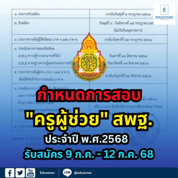 EZ Webmaster May 30, 2025 สพฐ.ประกาศปฏิทินสอบแข่งขันบรรจุ “ครูผู้ช่วย” พ.ศ.2568 EZ Webmaster May 30, 2025 สพฐ. ประกาศปฏิทินสอบ “ครูผู้ช่วย” ปี 2568 เริ่มรับสมัคร 9 ก.ค. นี้ สำนักงานคณะกรรมการการศึกษาขั้นพื้นฐาน (สพฐ.) ประกาศปฏิทินสอบแข่งขันเพื่อบรรจุและแต่งตั้งบุคคลเข้ารับราชการในตำแหน่ง “ครูผู้ช่วย” ประจำปี พ.ศ. 2568 อย่างเป็นทางการ โดยมีกำหนดเปิดรับสมัครภายในวันที่ 2 กรกฎาคม 2568 และเปิดรับสมัครตั้งแต่วันที่ 9–15 กรกฎาคม 2568 (รวมวันหยุดราชการ) ผู้สมัครที่มีคุณสมบัติตรงตามประกาศ จะมีสิทธิสอบข้อเขียนในสองภาคหลัก ได้แก่ ภาค ก: ความรู้ความสามารถทั่วไป… Continue Reading