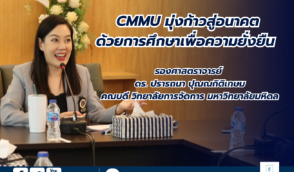 Blog CMMU มุ่งก้าวสู่อนาคตด้วยการศึกษาเพื่อความยั่งยืน EZ Webmaster December 19, 2024 CMMU มุ่งก้าวสู่อนาคตด้วยการศึกษาเพื่อความยั่งยืน ในปีที่ 28 ของการก่อตั้ง วิทยาลัยการจัดการ มหาวิทยาลัยมหิดล (CCMU) ได้ก้าวเข้าสู่ยุคใหม่ภายใต้การนำของรองศาสตราจารย์ ดร. ปรารถนา ปุณณกิติเกษม คณบดีคนใหม่ ผู้มุ่งมั่นที่จะเสริมสร้างการศึกษาให้มีความยั่งยืนและตอบโจทย์ความต้องการของผู้เรียนในยุคปัจจุบัน จุดเด่นที่ตอบโจทย์ยุคใหม่…