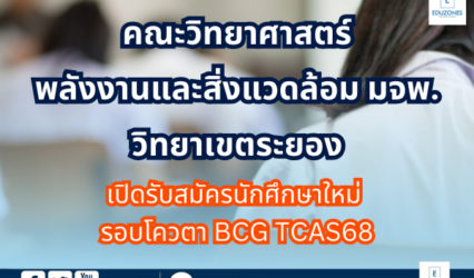 นักศึกษานักเรียนมหาวิทยาลัย คณะวิทยาศาสตร์ พลังงานและสิ่งแวดล้อม มจพ. วิทยาเขตระยอง เปิดรับสมัครนักศึกษาใหม่ รอบโควตา BCG TCAS68 EZ Webmaster December 4, 2024 คณะวิทยาศาสตร์ พลังงานและสิ่งแวดล้อม มจพ. วิทยาเขตระยอง เปิดรับสมัครนักศึกษาใหม่ รอบโควตา BCG TCAS68 คณะวิทยาศาสตร์ พลังงานและสิ่งแวดล้อม มหาวิทยาลัยเทคโนโลยีพระจอมเกล้าพระนครเหนือ วิทยาเขตระยอง เปิดรับสมัครนักศึกษาเพื่อเข้าศึกษาต่อในระดับปริญญาตรี 4 ปี…