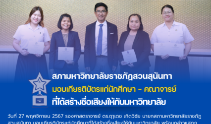 Blogนักศึกษา นักศึกษา สวนสุนันทา เข้ารับการแสดงความชื่นชมและเกียรติบัตรจากสภามหาวิทยาลัย tui sakrapee November 28, 2024 วันที่ 27 พฤศจิกายน 2567 รองศาสตราจารย์ ดร.ฤๅเดช เกิดวิชัย นายกสภามหาวิทยาลัยราชภัฏสวนสุนันทา มอบเกียรติบัตรแก่นักศึกษาที่ได้สร้างชื่อเสียงให้กับมหาวิทยาลัย พร้อมกล่าวแสดงความชื่นชมที่ทุกคนได้นำวิชาความรู้ไปใช้ให้เกิดประโยชน์จนส่งผลดีต่อตนเอง ณ ห้องประชุมสภามหาวิทยาลัยราชภัฏสวนสุนันทา รายชื่อนักศึกษาที่ได้รับรางวัลและอาจารย์ผู้ควบคุม – รางวัลชนะเลิศ…