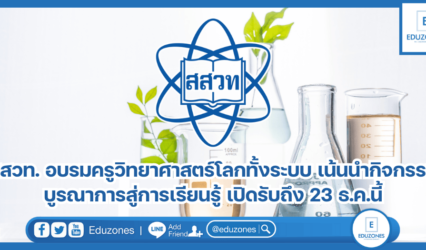 ครู-อาจารย์ สสวท. อบรมครูวิทยาศาสตร์โลกทั้งระบบ เน้นนำกิจกรรมวิทย์บูรณาการสู่การเรียนรู้ เปิดรับถึง 23 ธ.ค.นี้ EZ Webmaster November 25, 2024 สถาบันส่งเสริมการสอนวิทยาศาสตร์และเทคโนโลยี (สสวท.) โดยโครงการโลกศึกษาเพื่อพัฒนาสิ่งแวดล้อม (GLOBE) ปีงบประมาณ 2568 จะจัด “การอบรมหลักสูตรวิทยาศาสตร์โลกทั้งระบบ (ฉบับปรับปรุง 2564)” ในรูปแบบ Onsite วันที่ 25 – 27 มกราคม 2568 ณ โรงแรมบางแสน เฮอริเทจ จังหวัดชลบุรี รับสมัครโดยเป็นโรงเรียนระดับประถมศึกษาปีที่ 4-6 และมัธยมศึกษาปีที่ 1-3 เป็นครูผู้สอนวิชาวิทยาศาสตร์…