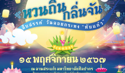 Blogกิจกรรม ชวนร่วมงานสืบสานประเพณีลอยกระทง หวนถิ่น กลิ่นจัน สืบสรรค์ วันลอยกระทง “ทับแก้ว” tui sakrapee November 8, 2024 ร่วมสืบสานประเพณีและสัมผัสมนต์เสน่ห์แห่งคืนลอยกระทง เชิญชวนทุกท่านร่วมงานสืบสานประเพณีลอยกระทง ประจำปี 2567 จัดโดย คณะศึกษาศาสตร์ ร่วมกับ กองกิจการนักศึกษา มหาวิทยาลัยศิลปากร หวนถิ่น กลิ่นจัน สืบสรรค์ วันลอยกระทง “ทับแก้ว” วันศุกร์ที่ 15…