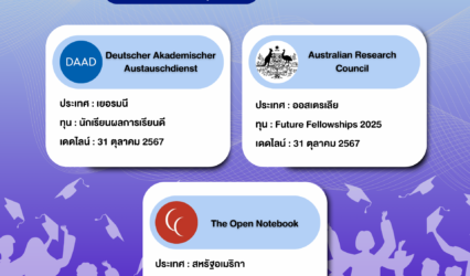 Blogครู-อาจารย์นักศึกษานักเรียน ทุนเรียนต่อต่างประเทศ ประจำเดือนตุลาคม EZ Webmaster October 7, 2024 ทุนเรียนต่อต่างประเทศ ประจำเดือนตุลาคม ! วันนี้ Eduzones ได้รวบรวมทุนเรียนต่อที่น่าสนใจ และกำลังจะปิดรับสมัครในสิ้นเดือนตุลาคมนี้มาแนะนำให้กับทุก ๆ ที่สนใจอยากจะเรียนต่อต่างประเทศได้ศึกษารายละเอียดกันค่ะ บอกเลยว่ามีทั้งทุนเรียนดี ทุนนักข่าว ทุนสำหรับนักวิจัย จากทั้งหมด 3 ประเทศด้วยกัน จะมีอะไรกันบ้างไปดูกันเลยค่ะ…