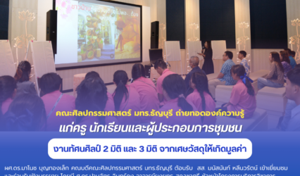 Blogนักศึกษา คณะศิลปกรรมศาสตร์ มทร.ธัญบุรี ถ่ายทอดองค์ความรู้งานทัศนศิลป์ 2 มิติ และ 3 มิติ จากเศษวัสดุให้เกิดมูลค่า แก่ครู นักเรียนและผู้ประกอบการชุมชน tui sakrapee October 4, 2024 ผศ.ดร.มาโนช บุญทองเล็ก คณบดีคณะศิลปกรรมศาสตร์ มหาวิทยาลัยเทคโนโลยีราชมงคลธัญบุรีให้การต้อนรับ ท่าน สส. มนัสนันท์ หลีนวรัตน์ เข้าเยี่ยมชมและร่วมรับฟังบรรยาย โดยมี ศ.ดร.ปานฉัตร อินทร์คง อาจารย์ยงยุทธ สกุลชาตรี หัวหน้าโครงการบริการวิชาการบรรยายภายใต้หัวข้อการถ่ายทอดองค์ความรู้งานทัศนศิลป์ 2…