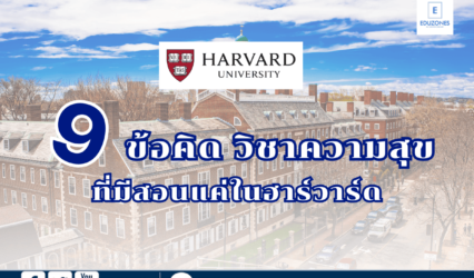 Blog 9 ข้อคิด “วิชาความสุขที่มีสอนแค่ในฮาร์วาร์ด” EZ Webmaster October 4, 2024 สุขภาพจิตสำคัญกับทุกคนไม่ว่าจะอยู่ในช่วงอายุ หรือช่วงวัยไหน วันนี้ Eduzones จะพาทุกคนมารู้จักเคล็ดลับการเติมความสุขในชีวิตง่าย ๆ ด้วยบทเรียนจากหนังสือ “วิชาความสุขที่มีสอนแค่ในฮาร์วาร์ด” ที่จะทำให้เราใช้ชีวิตอย่างมีความุสขในการใช้ชีวิตมากขึ้น จะมีอะไรบ้าง ไปดูกันเลยค่ะ ยอมรับอารมณ์ด้านลบ : อย่าปฏิเสธความรู้สึกเศร้า ผิดหวัง หรือกลัว…