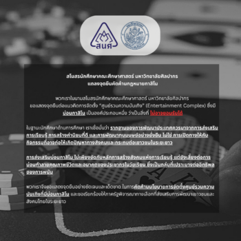 tui sakrapee April 9, 2025 สโมสรนักศึกษาคณะศึกษาศาสตร์ มหาวิทยาลัยศิลปากร แถลงจุดยืนคัดค้านกฎหมายกาสิโน tui sakrapee April 9, 2025 สโมสรนักศึกษาคณะศึกษาศาสตร์ มหาวิทยาลัยศิลปากร แถลงจุดยืนคัดค้านกฎหมายกาสิโน . พวกเรา ในนาม สโมสรนักศึกษาคณะศึกษาศาสตร์ ขอแสดงจุดยืนต่อแนวคิดการจัดตั้ง “ศูนย์รวมความบันเทิง” (Entertainment Complex) ซึ่งมี บ่อนกาสิโน เป็นองค์ประกอบหนึ่ง ว่าเป็นสิ่งที่ ไม่อาจยอมรับได้ . ในฐานะนักศึกษาด้านการศึกษา เราเชื่อมั่นว่า รากฐานของการพัฒนาประเทศควรมาจากการส่งเสริมการเรียนรู้ การสร้างค่านิยมที่ดี และการพัฒนาทุนมนุษย์อย่างยั่งยืน ไม่ใช่การเปิดทางให้กับกิจกรรมที่อาจก่อให้เกิดปัญหาทางสังคมและกระทบต่อเยาวชนในระยะยาว . การส่งเสริมบ่อนกาสิโน ไม่เพียงขัดกับหลักการสร้างสังคมแห่งการเรียนรู้ แต่ยังเสี่ยงต่อการบ่อนทำลายคุณภาพชีวิตและอนาคตของประชากรในวัยเรียน ซึ่งเป็นกลุ่มที่เปราะบางต่ออิทธิพลของการพนัน . พวกเราจึงขอแสดงจุดยืนอย่าง ชัดเจนและเด็ดขาด ในการ… Continue Reading