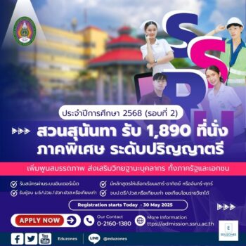 1,890 ที่นั่ง !! สวนสุนันทา เปิดรับนักศึกษาภาคพิเศษ ระดับปริญญาตรีประจำปีการศึกษา 2568 (รอบที่ 2) ถึง 31 พ.ค.นี้ tui sakrapee April 9, 2025 มหาวิทยาลัยราชภัฎสวนสุนันทา จะดำเนินการรับสมัครคัดเลือกบุคคลเข้าศึกษา ภาคพิเศษ ระดับปริญญาตรีประจำปีการศึกษา 2568 (รอบที่ 2) ระหว่างวันที่ 1 เมษายน – 31 พฤษภาคม 2568 โดยมีวัตถุประสงค์เพื่อเพิ่มพูนสมรรถภาพในการปฏิบัติงาน และส่งเสริมวิทยฐานะแก่บุคลากรตามความต้องการของหน่วยงานทั้งภาครัฐและเอกชน ตามรายละเอียดเกี่ยวกับการคัดเลือก ดังนี้ วิธีการสมัคร – สมัครทางอินเตอร์เน็ตที่ https://admission.ssru.ac.th/ ตั้งแต่วันที่ 1 เมษายน –31 พฤษภาคม 2568 ให้เลือกประเภท การรับสมัครนักศึกษา ภาคพิเศษ ระดับปริญญาตรีประจำปีการศึกษา2568 (รอบที่ 2) – ศึกษารายละเอียด เรื่อง การรับสมัครสอบคัดเลือกบุคคลเข้าศึกษาภาคพิเศษ ระดับปริญญาตรี ประจำปีการศึกษา 2568… Continue Reading