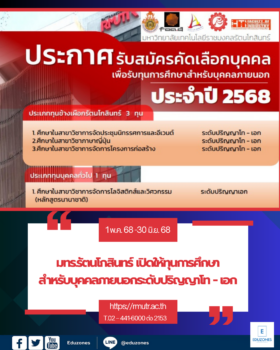 tui sakrapee April 3, 2025 มทร.รัตนโกสินทร์ เปิดให้ทุนการศึกษาสำหรับบุคคลภายนอกประจำปี 2568 ระดับปริญญาโท – เอก tui sakrapee April 3, 2025 มหาวิทยาลัยเทคโนโลยีราชมงคลรัตนโกสินทร์ ประกาศรับสมัครคัดเลือกบุคคลเพื่อรับทุนการศึกษาสำหรับบุคคลภายนอกประจำปี 2568 ประเภททุนช้างเผือกรัตนโกสินทร์ 3 ทุน 1. ศึกษาในสาขาวิชาการจัดประชุมนิทรรศการและอีเวนต์ ระดับปริญญาโท – เอก 2.ศึกษาในสาขาวิชาภาษาญี่ปุ่น ระดับปริญญาโท – เอก 3.ศึกษาในสาขาวิชาการจัดการโครงการก่อสร้าง ระดับปริญญาโท – เอก ประเภททุนบุคคลทั่วไป 1 ทุน 1. ศึกษาในสาขาวิชาการจัดการโลจิสติกส์และวิศวกรรม ระดับปริญญาเอก (หลักสูตรนานาชาติ) คุณสมบัติของผู้สมัครรับทุน 1. ผู้สมัครรับทุนช้างเผือกรัตนโกสินทร์ ต้องเป็นผู้สำเร็จการศึกษาจากมหาวิทยาลัยและได้รับการตอบรับเข้าศึกษาต่อหรือกำลังศึกษาต่อระดับปริญญาโท ในภาคปกติ หรือภาคนอกเวลา… Continue Reading