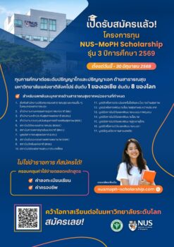 NUS-MoPH 2026 ทุนเต็มจำนวน เปิดรับแล้ว มอบให้แพทย์และบุคลากรด้านสาธารณสุข tui sakrapee April 1, 2025 เปิดรับสมัครแล้ว! ทุนการศึกษา NUS-MoPH 2026 โอกาสทองสำหรับแพทย์และบุคลากรด้านสาธารณสุข! .โอกาสที่ทุกคนรอคอยกลับมาอีกครั้ง “ทุนการศึกษาระดับปริญญาโทและปริญญาเอกด้านสาธารณสุข ณ มหาวิทยาลัยแห่งชาติสิงคโปร์ (NUS) ประจำปีการศึกษา 2569” เปิดรับสมัครแล้ว. ทุนการศึกษานี้ครอบคลุมค่าใช้จ่ายหลักตลอดหลักสูตร ค่าเล่าเรียนเต็มจำนวน ค่าครองชีพระหว่างการศึกษา. ทุนการศึกษานี้เหมาะกับใครบ้าง ทุนการศึกษานี้เหมาะสำหรับแพทย์หรือบุคลากรด้านสาธารณสุขที่ปฏิบัติงานในหน่วยงานที่กำหนด แม้ไม่ใช่ข้าราชการ ก็สมัครรับทุนได้!พิเศษ ปีนี้เพิ่ม 9 หน่วยงานที่มีสิทธิ์สมัครรับทุน. อย่าลืม สอบภาษาอังกฤษก่อนยื่นสมัครทุนการศึกษา ปริญญาโท: TOEFL (iBT) ≥ 85 หรือ IELTS ≥ 6 ปริญญาเอก: TOEFL (iBT) ≥ 94 หรือ IELTS ≥ 7 สำหรับผู้ที่ยื่น TOEFL (iBT) ต้องแจ้งสถาบันที่ทำการสอบให้ส่งใบผลคะแนนไปยัง Saw Swee Hock School of Public Health (TOEFL Institutional… Continue Reading