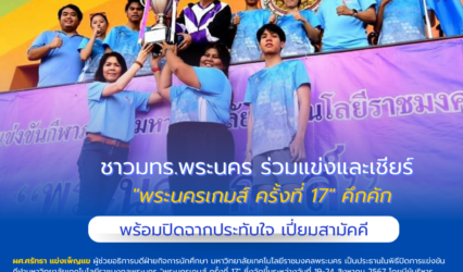 Blogนักศึกษา ชาวมทร.พระนคร ร่วมแข่งและเชียร์ “พระนครเกมส์ ครั้งที่ 17” คึกคัก พร้อมปิดฉากประทับใจ tui sakrapee August 27, 2024 วันที่ 24 สิงหาคม 2567 ผศ.ศรัทธา แข่งเพ็ญแข ผู้ช่วยอธิการบดีฝ่ายกิจการนักศึกษา มหาวิทยาลัยเทคโนโลยีราชมงคลพระนคร เป็นประธานในพิธีปิดการแข่งขันกีฬามหาวิทยาลัยเทคโนโลยีราชมงคลพระนคร “พระนครเกมส์ ครั้งที่ 17” ซึ่งจัดขึ้นระหว่างวันที่ 19-24 สิงหาคม 2567…