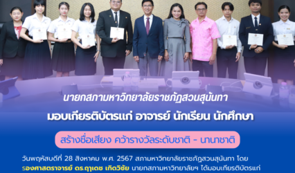 Blogนักศึกษา นายกสภามหาวิทยาลัยราชภัฏสวนสุนันทา มอบเกียรติบัตรแก่อาจารย์ นักเรียน นักศึกษา ที่สร้างชื่อเสียงให้มหาวิทยาลัยทั้งระดับชาติและนานาชาติ tui sakrapee August 28, 2024 เด็กสวนสุนันทา สร้างชื่อเสียงคว้ารางวัลระดับชาติและนานาชาติ วันพฤหัสบดีที่ 28 สิงหาคม พ.ศ. 2567 สภามหาวิทยาลัยราชภัฏสวนสุนันทา โดย รองศาสตราจารย์ ดร.ฤๅเดช เกิดวิชัย นายกสภามหาวิทยาลัยฯ ได้มอบเกียรติบัตรแก่อาจารย์ นักเรียน นักศึกษา…