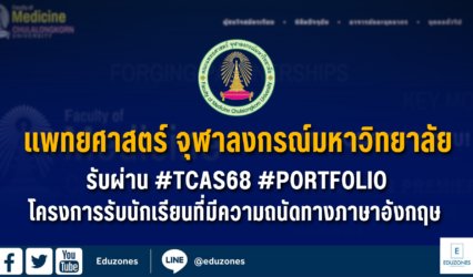 Blogนักศึกษานักเรียน แพทยศาสตร์ จุฬาลงกรณ์มหาวิทยาลัย ประกาศเกณฑ์รอบที่ 1 (Portfolio) โครงการรับนักเรียนที่มีความถนัดทางภาษาอังกฤษ EZ Webmaster August 21, 2024 คณะแพทยศาสตร์ จุฬาลงกรณ์มหาวิทยาลัย เห็นสมควรดำเนินการรับสมัครและสอบคัดเลือกนักเรียนที่มีความถนัดทางภาษาอังกฤษ เข้าศึกษาในหลักสูตรแพทยศาสตรบัณฑิต คณะแพทยศาสตร์ จุฬาลงกรณ์มหาวิทยาลัย ปีการศึกษา 2568 (TCAS68) รอบที่ 1 แฟ้มสะสมผลงาน (Portfolio) โดยมีรายละเอียดดังต่อไปนี้ จำนวนรับเข้าศึกษา จำนวน…