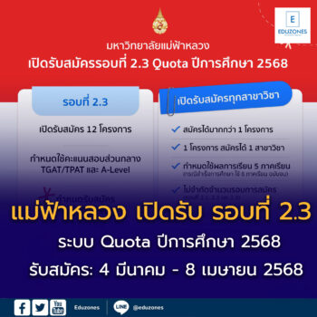 มหาวิทยาลัยแม่ฟ้าหลวง เปิดรับสมัครรอบที่ 2.3 ระบบ Quota TCAS68 EZ Webmaster March 22, 2025 มหาวิทยาลัยแม่ฟ้าหลวง กำลังเปิดรับสมัครรอบที่ 2.3 ระบบ Quota ปีการศึกษา 2568 กำหนดรับสมัคร: วันที่ 4 มีนาคม – 8 เมษายน 25681. รับตรงทั่วประเทศ รูปแบบใช้ผลคะแนน A-Levelรายละเอียดประกาศ: https://bit.ly/40GenOk2. รับตรงทั่วประเทศ รูปแบบใช้ผลคะแนน TGAT/TPAT และ A-Levelรายละเอียดประกาศ: https://bit.ly/42ENxst3. รับตรงทั่วประเทศ รูปแบบใช้ผลคะแนน GPAX TGAT/TPAT และ A-Levelรายละเอียดประกาศ: https://bit.ly/4jVR1xd4. หลักสูตรแพทยศาสตรบัณฑิต โควตาภาคเหนือรายละเอียดประกาศ: https://bit.ly/40EpwR05. หลักสูตรทันตแพทยศาสตรบัณฑิต โควตาภาคเหนือรายละเอียดประกาศ: https://bit.ly/3WDuFpZ6. หลักสูตรทันตแพทยศาสตรบัณฑิต โควตาบุตรธิดาบุคลากรทางการแพทย์และสาธารณสุขหรือพนักงานมหาวิทยาลัยแม่ฟ้าหลวงรายละเอียดประกาศ: https://bit.ly/3CeLyk17. หลักสูตรพยาบาลศาสตรบัณฑิต รูปแบบใช้ผลคะแนน A-Levelรายละเอียดประกาศ: https://bit.ly/4hFmWjs8. หลักสูตรการแพทย์แผนจีนบัณฑิต รูปแบบใช้ผลคะแนน TGAT/TPAT และ… Continue Reading