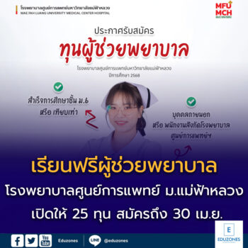 EZ Webmaster March 22, 2025 โรงพยาบาลศูนย์การแพทย์มหาวิทยาลัยแม่ฟ้าหลวง เปิดให้ 25 ทุน เรียนฟรีผู้ช่วยพยาบาล EZ Webmaster March 22, 2025 ประกาศรับสมัครทุนผู้ช่วยพยาบาล โรงพยาบาลศูนย์การแพทย์มหาวิทยาลัยแม่ฟ้าหลวง ปีการศึกษา 2568 เปิดรับสมัครแล้ว! ตั้งแต่วันนี้ – 30 เมษายน 2568 คุณสมบัติเบื้องต้น• สำเร็จการศึกษาชั้น ม.6 หรือเทียบเท่า• เปิดรับทั้งบุคคลภายนอก และพนักงานของโรงพยาบาลศูนย์การแพทย์ฯ ดูรายละเอียดเพิ่มเติม คลิก สอบถามเพิ่มเติม โทร. 0 5391 4030ที่มา : HR – MFU Medical Center Hospital Continue Reading