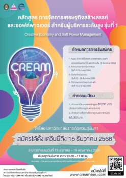 SSRU เปิดหลักสูตรผู้บริหารยุคใหม่ CREAM รุ่นที่ 1 ปั้นผู้นำ Soft Power ไทยสู่เวทีโลก – เข้มข้น 5F พร้อมดูงานเครือข่ายระดับสูง! tui sakrapee November 21, 2025 ✨ “หลักสูตรการจัดการเศรษฐกิจสร้างสรรค์และซอฟต์พาวเวอร์ สำหรับผู้บริหารระดับสูง” ✨ เสริมสร้างวิสัยทัศน์เชิงกลยุทธ์และทักษะการบริหารเพื่อขับเคลื่อน Soft Power ของไทยสู่เวทีโลก ผ่านการเรียนรู้เชิงลึก กิจกรรมดูงาน และเครือข่ายผู้บริหารระดับสูง 📌 ระยะเวลาอบรม: 13 มกราคม – 26 พฤษภาคม 2569 📆 วันเรียน: ทุกวันอังคาร เวลา 13.00 – 17.00 น. 🌏 หลักสูตรเน้น “5F” ตามกรอบของกระทรวงวัฒนธรรม ได้แก่ 🍲 Food | 🎬 Film | 👗 Fashion | 🥊… Continue Reading