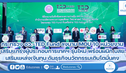 ครู-อาจารย์ กระทรวง อว.-TED Fund ลงนาม MOU 10 หน่วยงาน เสริมแกร่งผู้ประกอบการเทคฯ รุ่นใหม่ พร้อมผนึก บสย. เสริมแหล่งเงินทุน ดันธุรกิจนวัตกรรมเติบโตมั่นคง คาดสร้างมูลค่าทางเศรษฐกิจ 1 พันล้านบาท ในปี 67 EZ Webmaster July 30, 2024 กองทุนพัฒนาผู้ประกอบการเทคโนโลยีและนวัตกรรม หรือ TED Fund กระทรวงการอุดมศึกษา วิทยาศาสตร์ วิจัยและนวัตกรรม (อว.) จัดพิธีลงนามความร่วมมือกับเครือข่ายร่วมพัฒนาผู้ประกอบการ (TED Fellow) รวม 10 หน่วยงาน เน้นสนับสนุนผู้ประกอบการเทคโนโลยีและนวัตกรรมรุ่นใหม่ เข้าถึงแหล่งเงินทุน เสริมศักยภาพ ยกระดับความสามารถในการแข่งขันด้านธุรกิจไทยอย่างมั่นคง พร้อมลงนาม บรรษัทประกันสินเชื่ออุตสาหกรรมขนาดย่อม…