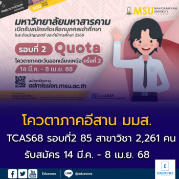 EZ Webmaster March 14, 2025 โควตาภาคตะวันออกเฉียงเหนือ TCAS68 รอบที่ 2 ม.มหาสารคาม EZ Webmaster March 14, 2025 14 มี.ค. – 8 เม.ย. 68 เปิดรับสมัคร โควตาภาคตะวันออกเฉียงเหนือ มมส.รอบที่ 2 รับ 85 สาขาวิชา 2,261 คน (สำหรับผู้ที่เรียนอยู่ในสถานศึกษาภาคตะวันออกเฉียงหนือเท่านั้น) สมัครออนไลน์ จ่ายเงินทาง QR-Code ไม่ต้องอัปโหลดเอกสารอะไรเลย ติ๊กแค่คะแนน TGAT/TPAT/A-Level ในระบบรับสมัคร มมส จะดึงคะแนนเอง ระบบรับสมัคร คลิก ประกาศรับสมัคร คลิก ก่อนสมัครทุกโควตา ผู้สมัครต้องลงทะเบียน TCAS68… Continue Reading
