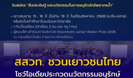 กิจกรรมBlogนักศึกษานักเรียน สสวท. ชวนเยาวชนไทยโชว์ไอเดียประกวดนวัตกรรมอนุรักษ์ทรัพยากรน้ำ สู่เวทีโลก TJWP 2026 ที่สวีเดน EZ Webmaster January 12, 2026 สสวท. ชวนเยาวชนไทยโชว์ไอเดียประกวดนวัตกรรมอนุรักษ์ทรัพยากรน้ำ สู่เวทีโลก TJWP 2026 ที่สวีเดน สถาบันส่งเสริมการสอนวิทยาศาสตร์และเทคโนโลยี (สสวท.) เชิญเยาวชนสมัครเข้าร่วมการประกวดสิ่งประดิษฐ์และนวัตกรรมในการอนุรักษ์ทรัพยากรน้ำ ปี 2569 “Thailand Junior Water Prize 2026” (TJWP 2026) หัวข้อ “Water for…
